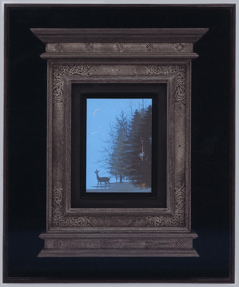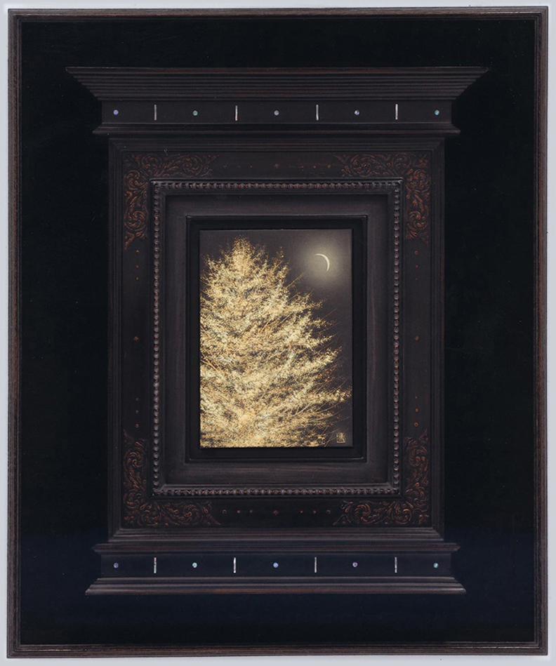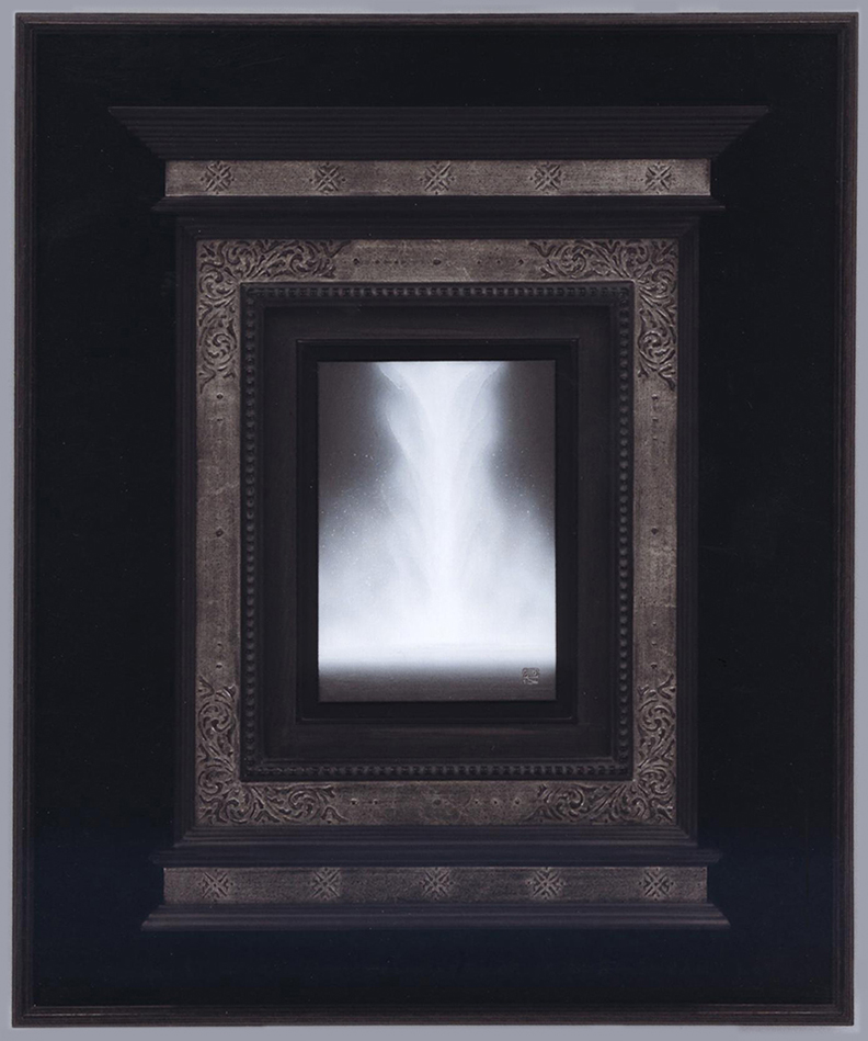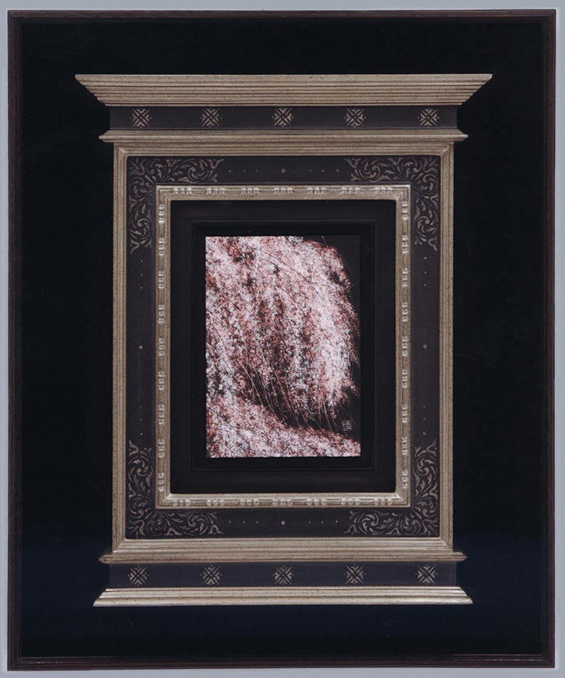 千住博先生の作品の額縁です。デパートと画廊の企画で作成のご依頼をいただき、特別な額縁を作りました。 祭壇様式の額縁を従来の絵画に使うことはありませんが、今回お預かりした千住先生の作品を見た瞬間、背筋にゾクッと来るものを覚え、先生の絵の中に美の神を感じられ、このような祭壇縁の中に納めてみました。 サイズ 227×158mm